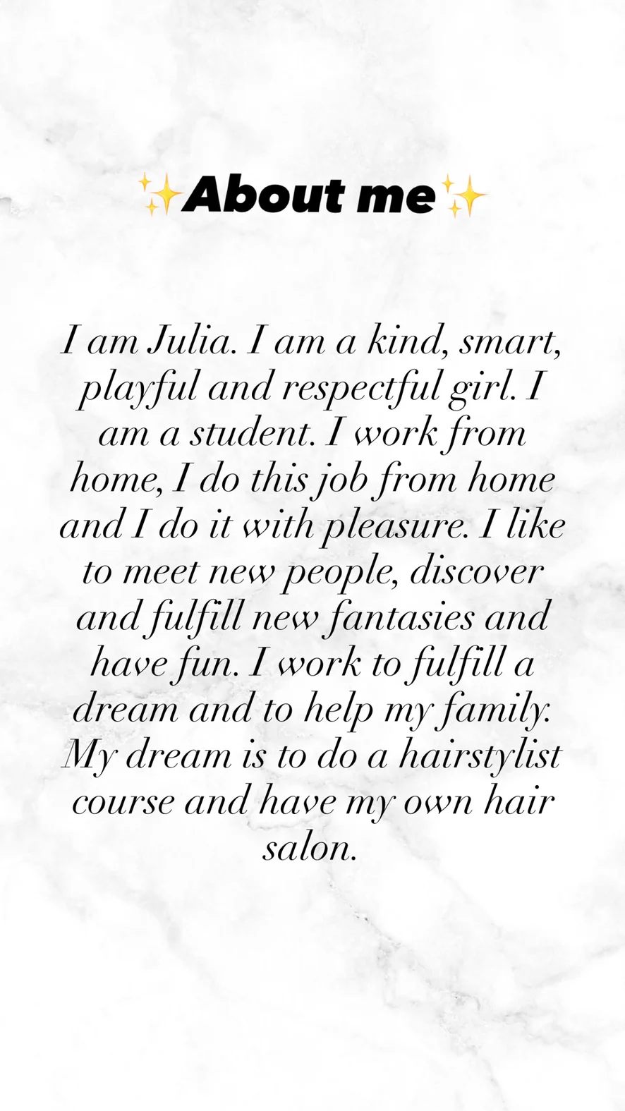 Ahegao, Tarian Erotis, Tingkat Penis, Blowjob, Fetish Kaki, Berkedip, Pijat, Nilon, Kulit, Tittyfuck, Pertunjukan Minyak, Striptis, Topless, Twerk, Pantat ke Mulut, Cowgirl, Dirty Talk, Instruksi Masturbasi, Bermain Peran, Mainan Seks, Masturbasi, Doggy Style, Anal, Air mani, Dildo atau Vibrator, Mandi, Krim, Merokok, Hardcore, Squirt, Mainan Anal, Meraba, Orgasme, Heels, Tenggorokan, Penghinaan, Kaki Unta